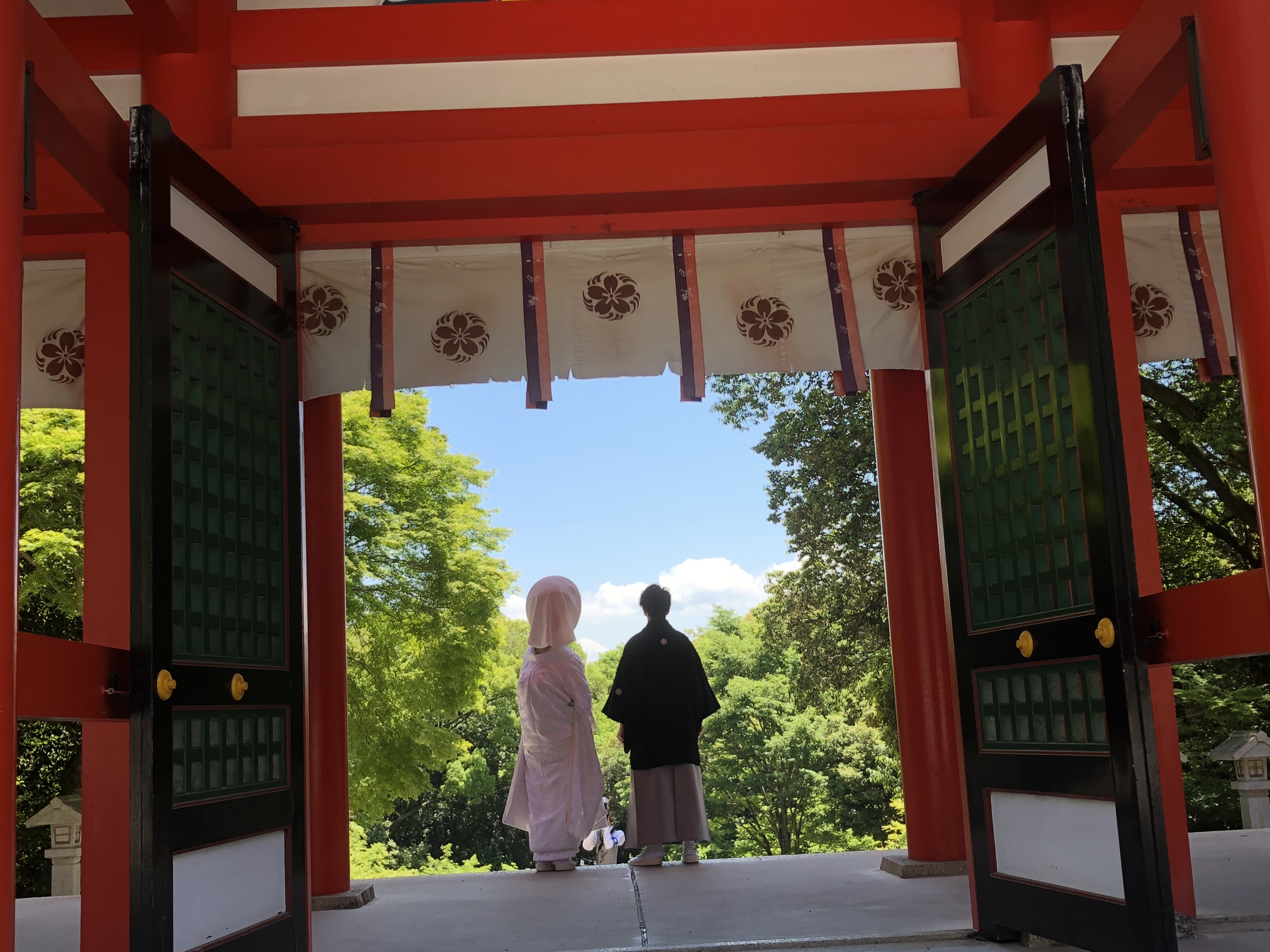 梅雨とは思えないほどの青空・・ 近江神宮のメインの楼門下で紋付・白無垢姿のお二人は大変綺麗で絵になっていました